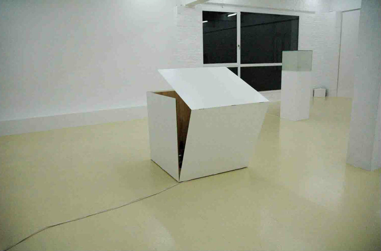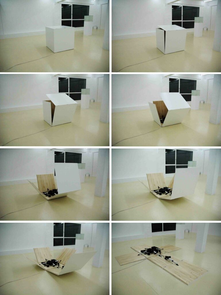 In de expositieruimte is een witte kubus geplaatst. Op een gegeven ogenblik ontvouwt de kubus zichzelf.